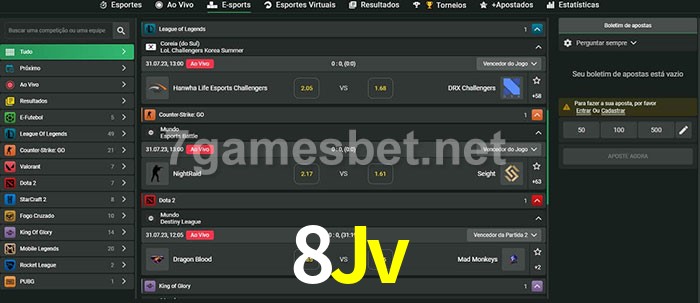 O 8Jv oferece uma grande seleção de opções de apostas em e-sports com probabilidades competitivas